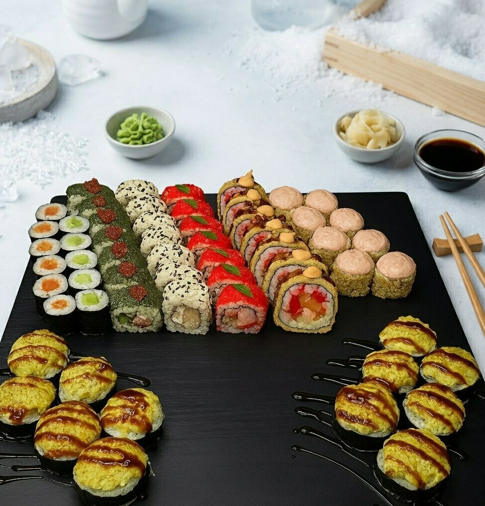 Наслаждайтесь набором "ЭдоКо" — 64 штуки изысканных роллов в нежном сочетании вкусов! Включает классическую Калифорнию с креветкой, ароматный ролл Лава, сочный ролл с курицей, нежный ролл с копченым лососем, хрустящий в кляре с окунем и запеченный под фирменным соусом Удзай. Идеальный баланс свежести, хруста и пикантности для настоящих гурманов! ЦЕНА: 4850 руб