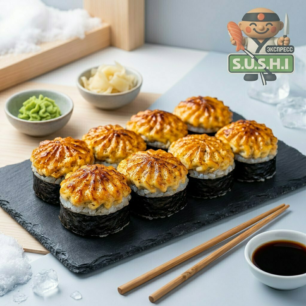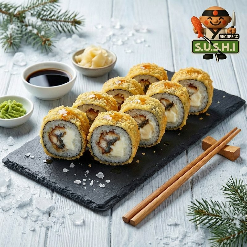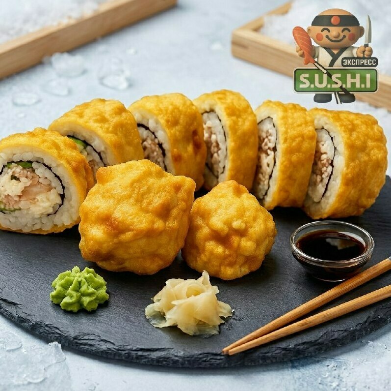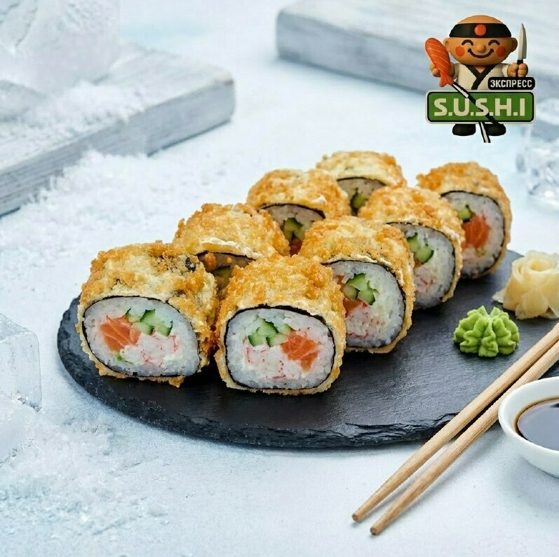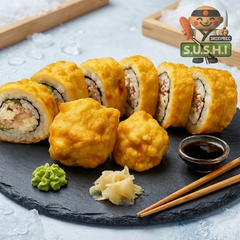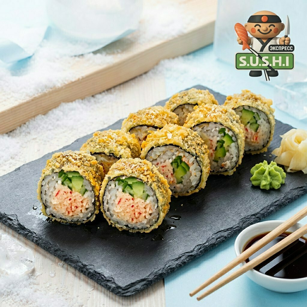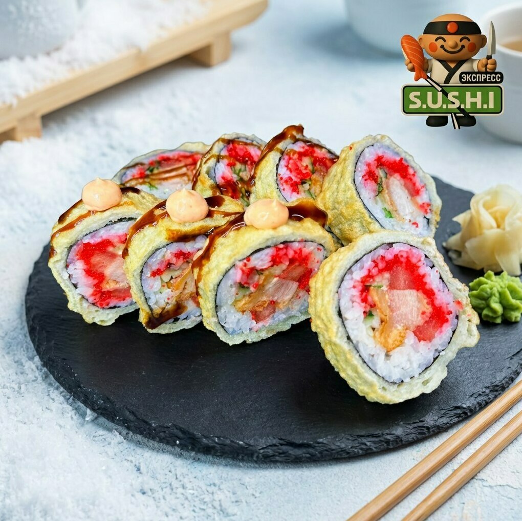 Хот Калифорния 8 шт. Описание: Хрустящий теплый ролл в кляре с нежным снежным крабом, кремовым авокадо и свежим огурцом. Украшен пикантным спайси соусом. Идеален для ценителей ярких вкусов и теплых текстур. Вес: 250–260 г. Калорийность: 360 ккал. БЖУ: 10 г белков, 12 г жиров, 50 г углеводов. Цена: 690 руб.