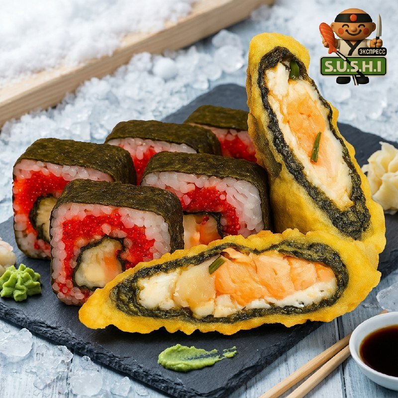 Сакана Темпура (7 шт.) Хрустящий тёплый ролл с нежным лососем, сочным гребешком и снежным крабом. Дополнен кремовым авокадо, свежим огурцом и яркой икрой тобико. Идеально для ценителей изысканных морских вкусов. Вес: 200-220 г Калорийность: 278 ккал Белки: 13 г Жиры: 9 г Углеводы: 38 г Цена: 840 руб.